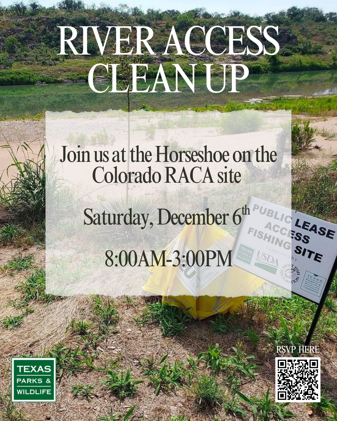 I am eager to share information about the River Access and Conservation Area clean up on Saturday December 6th from 8:00AM-3:00PM. We are conducting this clean up at our Horseshoe on the Colorado RACA Site located on the Colorado River in Bastrop, Texas. I’m hoping you and your loved ones can join my family and I that day!